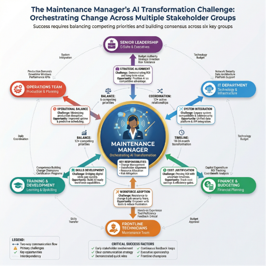 For maintenance managers and reliability leaders, the challenge of AI transformation is less technical than organizational. While AI can optimize schedules and predict failures, you must navigate change management, workforce development, budget justification, and cross-functional collaboration with operations, engineering, and IT.