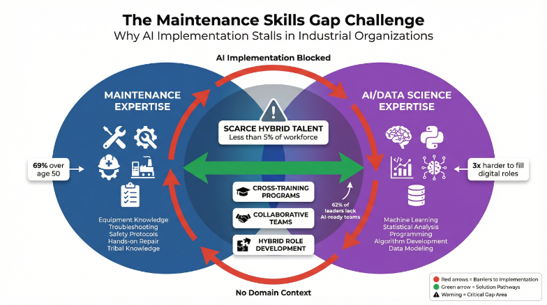 The skills gap is circular and self-reinforcing: maintenance teams lack AI expertise, while data science teams lack maintenance domain knowledge. Finding professionals who understand both vibration analysis and machine learning algorithms is extraordinarily difficult.