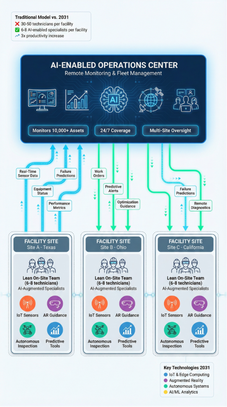 Third, prepare for structural organizational change. The maintenance organization of 2031 will be structurally different: flatter hierarchies, more centralized monitoring, and more distributed execution. Remote operations centers will oversee AI-monitored asset fleets across multiple facilities, while smaller, highly skilled on-site teams handle physical interventions guided by AI copilots. The traditional model of large maintenance crews at each facility is giving way to centralized expertise supporting distributed assets.